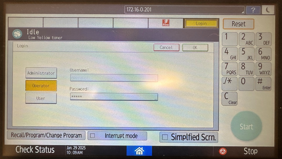 Select Operator from on the left, and enter password "73072". Tap OK to confirm.