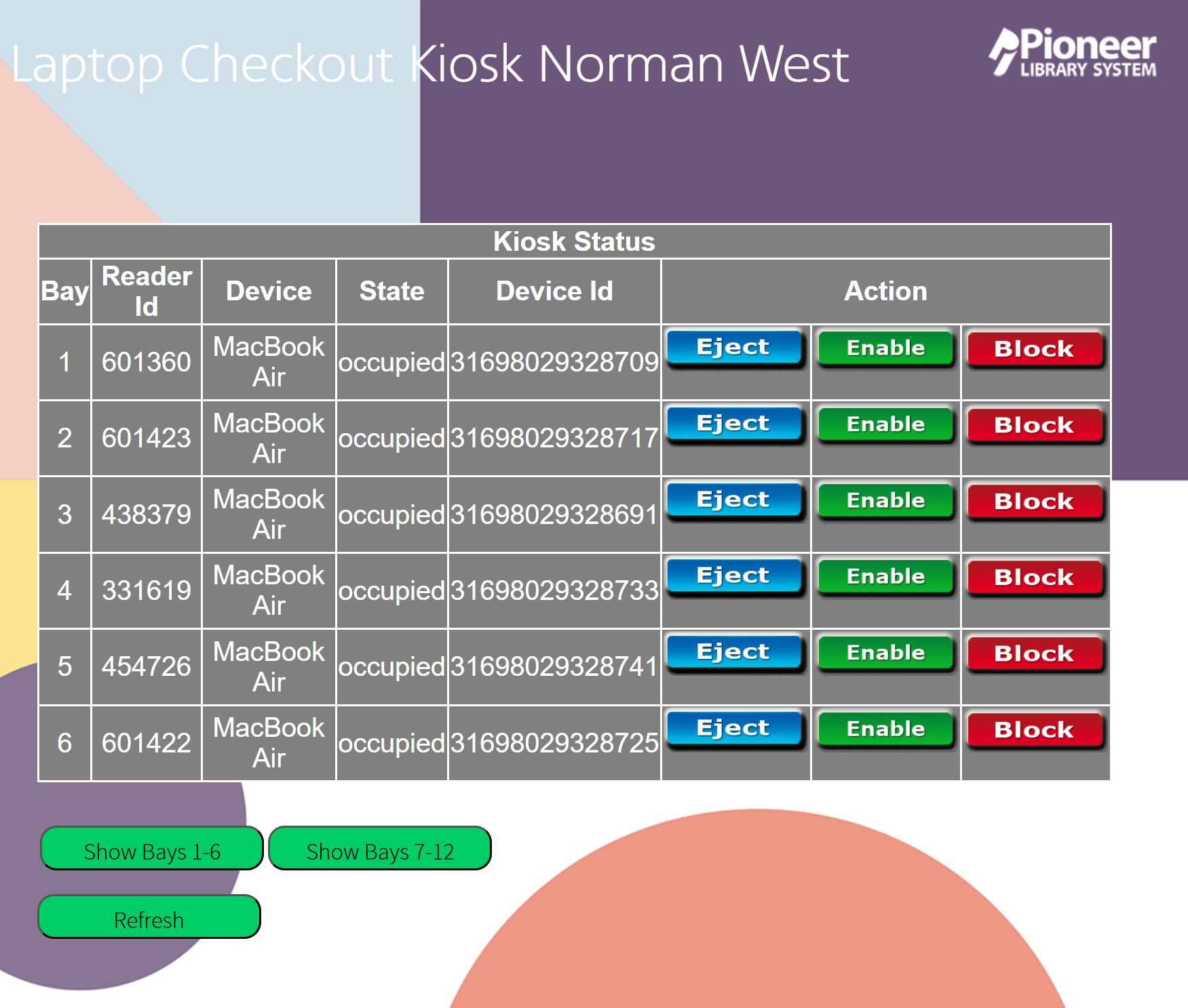 Light Admin mode allows library staff to view and manage the status of laptop bays on a Laptops Anytime kiosk. Staff can block or enable individual slots and eject laptops if necessary.