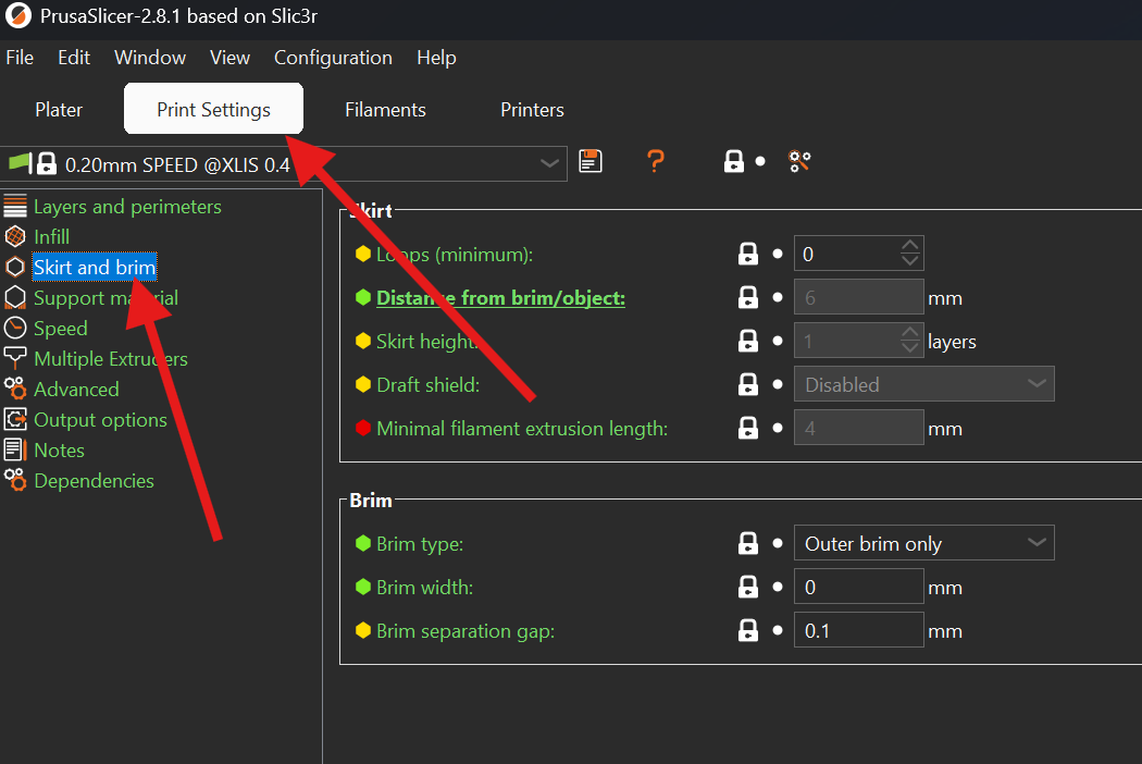 In Prusa slicer software, these options are located in Print Settings>>Skirt and Brim or Print Settings>>Advanced>>Elephant Foot Compensation