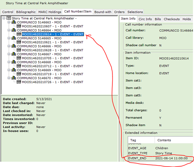· Click the Call Number/Item tab, it will list the associated event id(s) aka item ids. If it is a reoccurring event, multiple item ids will be listed. Click on an item id and look in the extended information section at “Event End” date to be sure you have the correct event id – in the example in the image below the event id is MOO514620210614 and is scheduled to end on June 14th 2021 at 11. (Another quick way to tell is last 7 digits of the item id will be the program date YYYYMMDD – see highlighted section above)