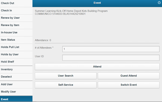 11. Guest Attend – Tapping Guest Attend will automatically increase the Attendance #. This may be used for users that do not have a library account.