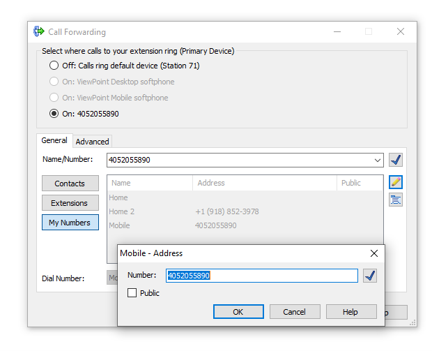 Tip: If you want forwarding to remain active even after logging into ViewPoint again, set up a Call Rule instead of using the Call Forwarding option. Call Rules are server-based and stay active until you disable them. See Setting Up Call Rules for more details.