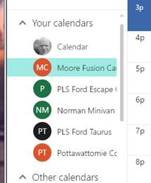 5. This will bring up a blended view of both your calendar and the vehicle calendar. For clarity’s sake, it is easiest to leave only the vehicle calendar up while you are reserving a vehicle, so the side pane will look like this while you are making a reservation: