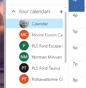 7. Once you are done, you can highlight your calendar and unhighlight the vehicle calendar, to see only your calendar again. At that point, your side pane should look like this: