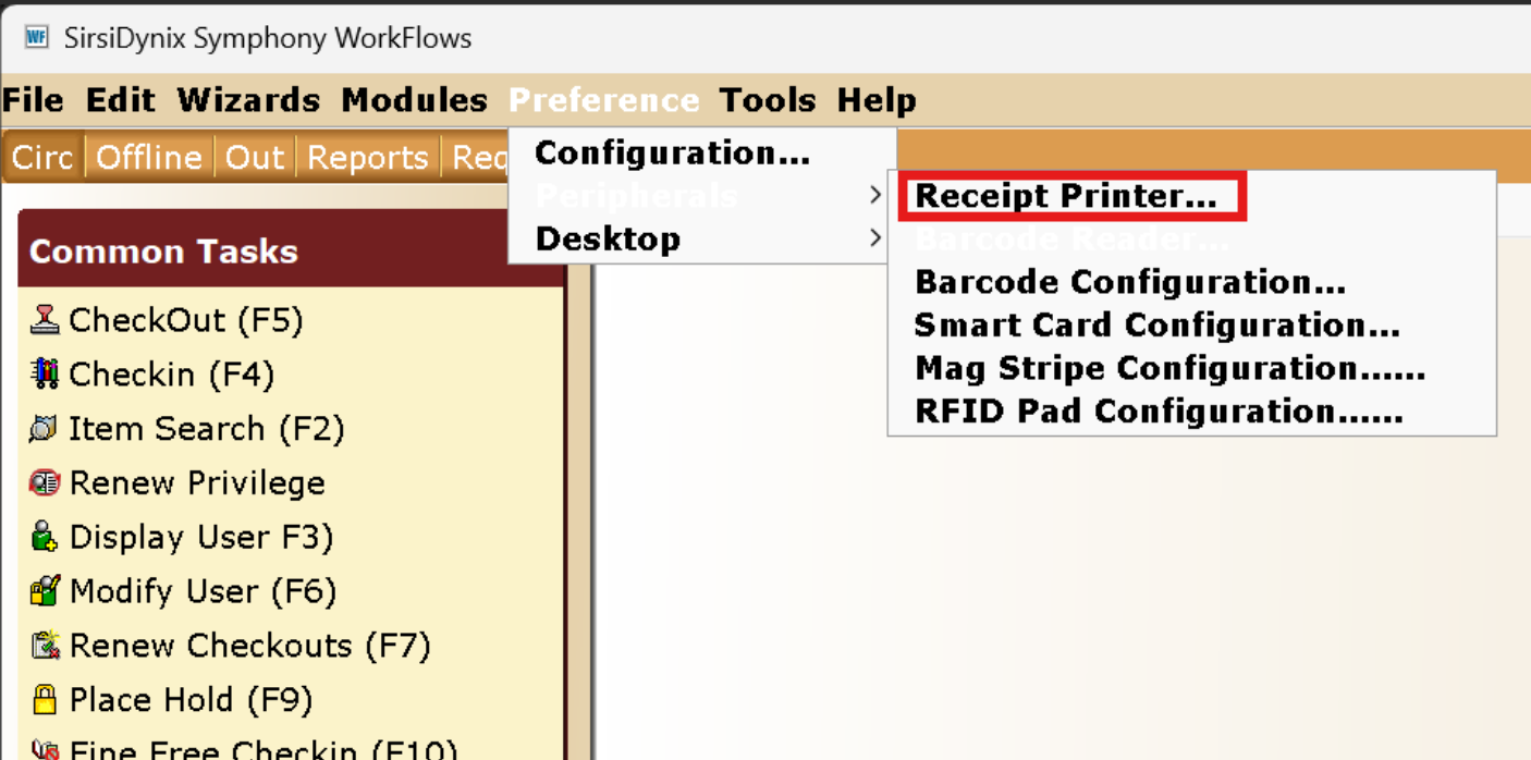 In Workflows on the top menu bar: Preference > Peripherals > Receipt Printer