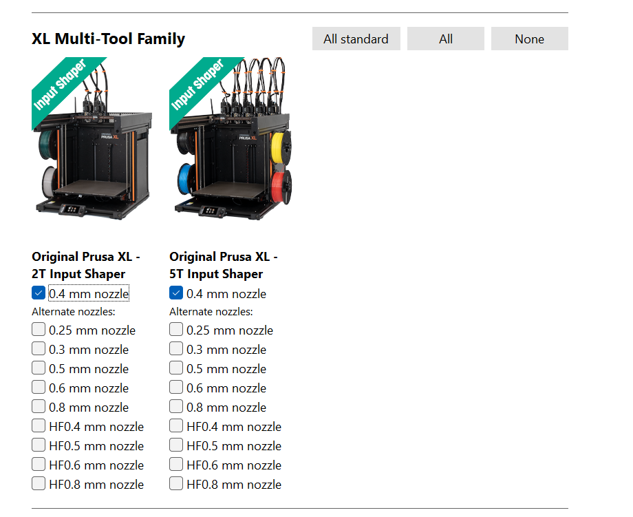 - Scroll down until you find the XL Multitool Family section. Select the 0.4mm Nozzle option on both the 2T and 5T models.