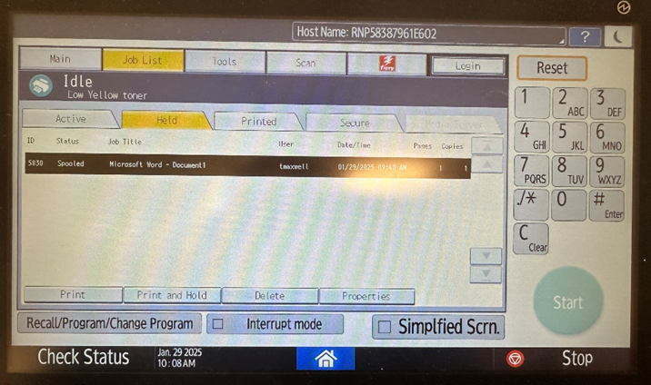 Once confirmed, the job will begin printing, and the held job will be removed from the list.